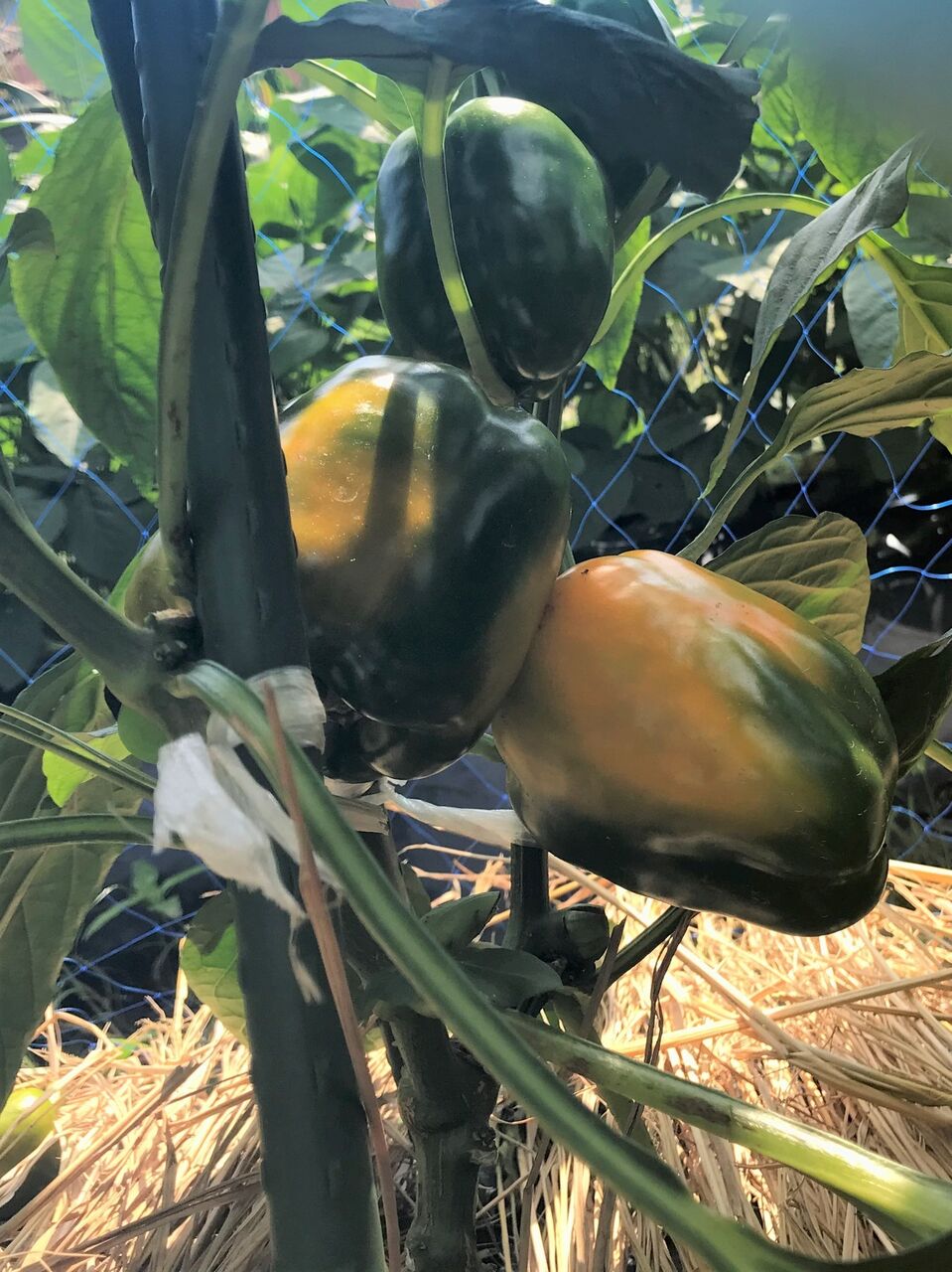 ナス、ピーマンも例年に比べて育ちが悪くて、枝が2段目テープの高さまで伸びていないものが多いです。これから日照時間が長くなって回復してくれると良いですが。