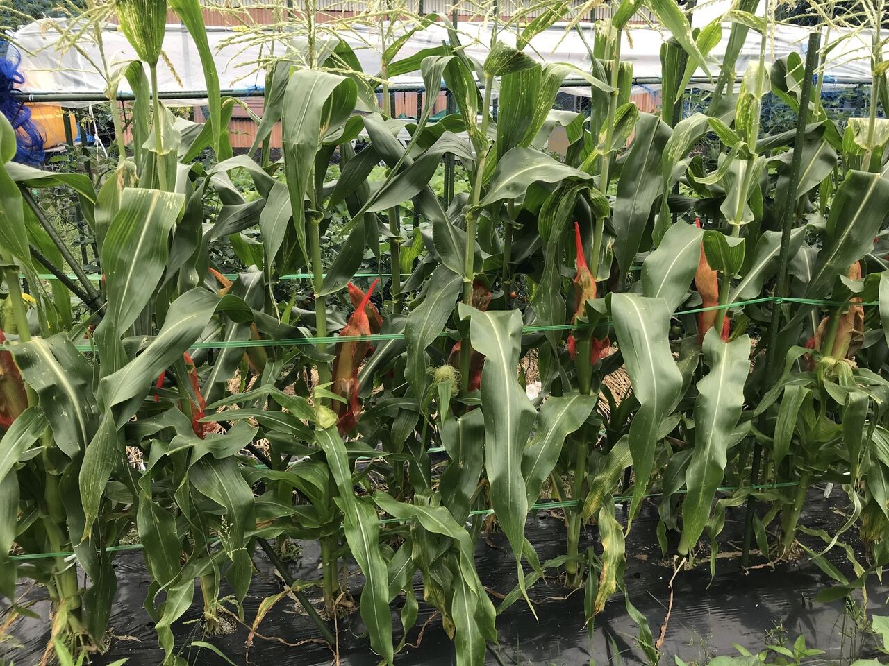 スィートコーン2の実も大きくなってきたので、カラスが食べる前にみかんネットをかけました。