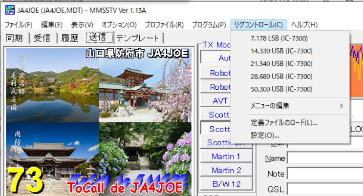 MMSSTVのメニューバーの「リグコントロール」にリグコントロールメニューがあります。(IC-7300に変更後の画像です。)