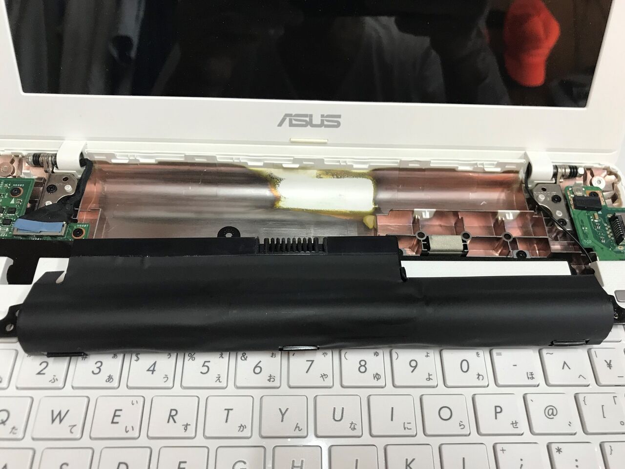 なんだかバッテリーの裏がベタベタしていて、筐体プラスチックの金属膜(真空蒸着)が無くなっています。(@_@)