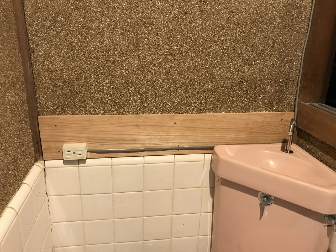 ウォシュレットの電源コードが1mしか無いので、後ろの壁にコンセントを新設する事にしましたが、土壁でネジ止め出来ないので杉板を取付けてコンセントを設置する事にしました。