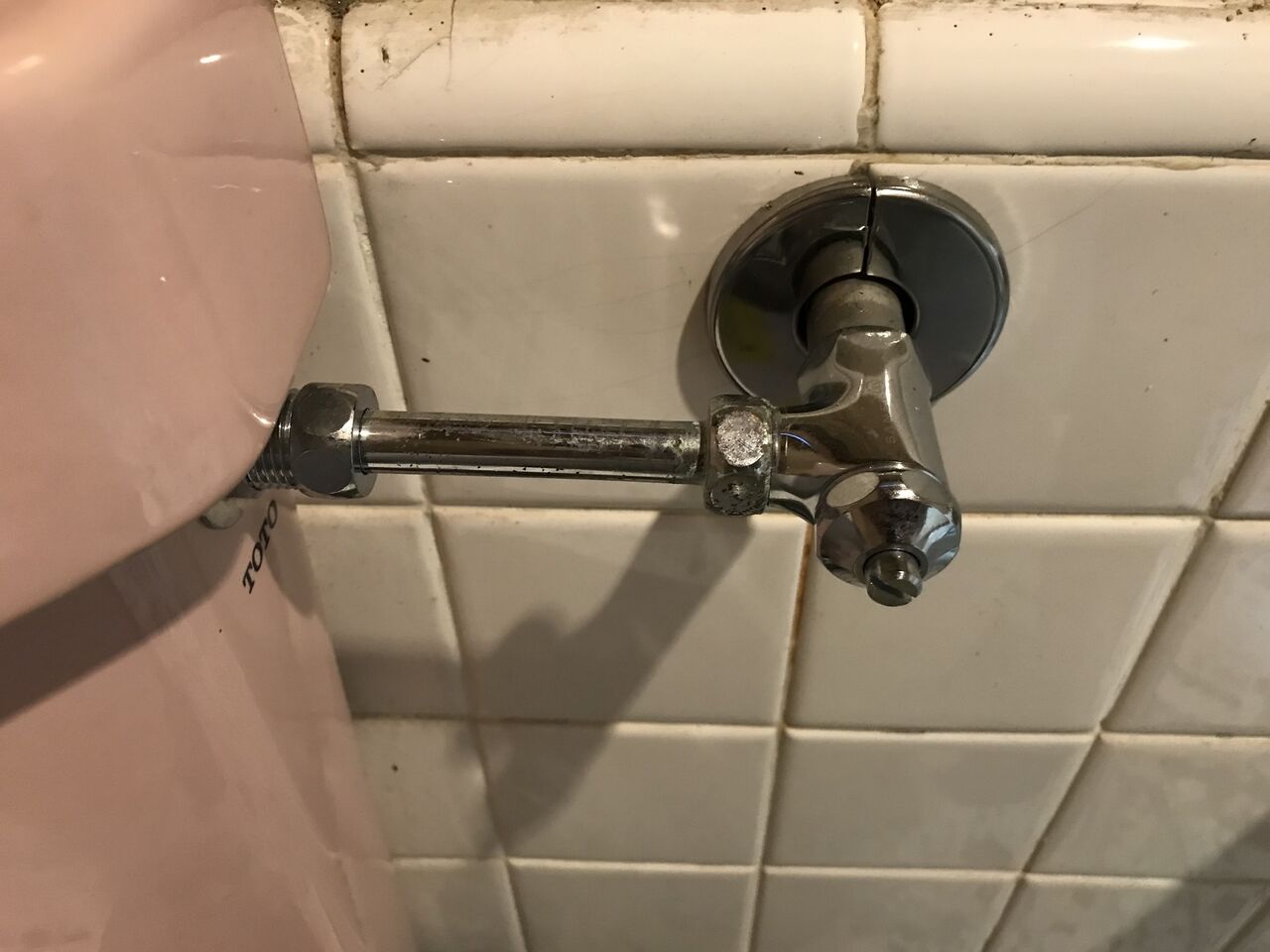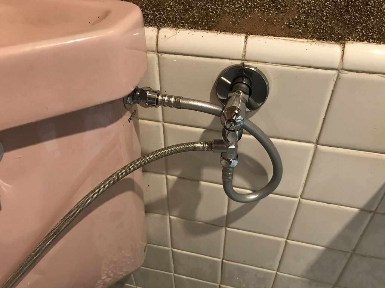 止水栓とロータンクの距離が近くて、給水ホースの分岐金具を入れるのが難しいので止水栓の向きを変えました。