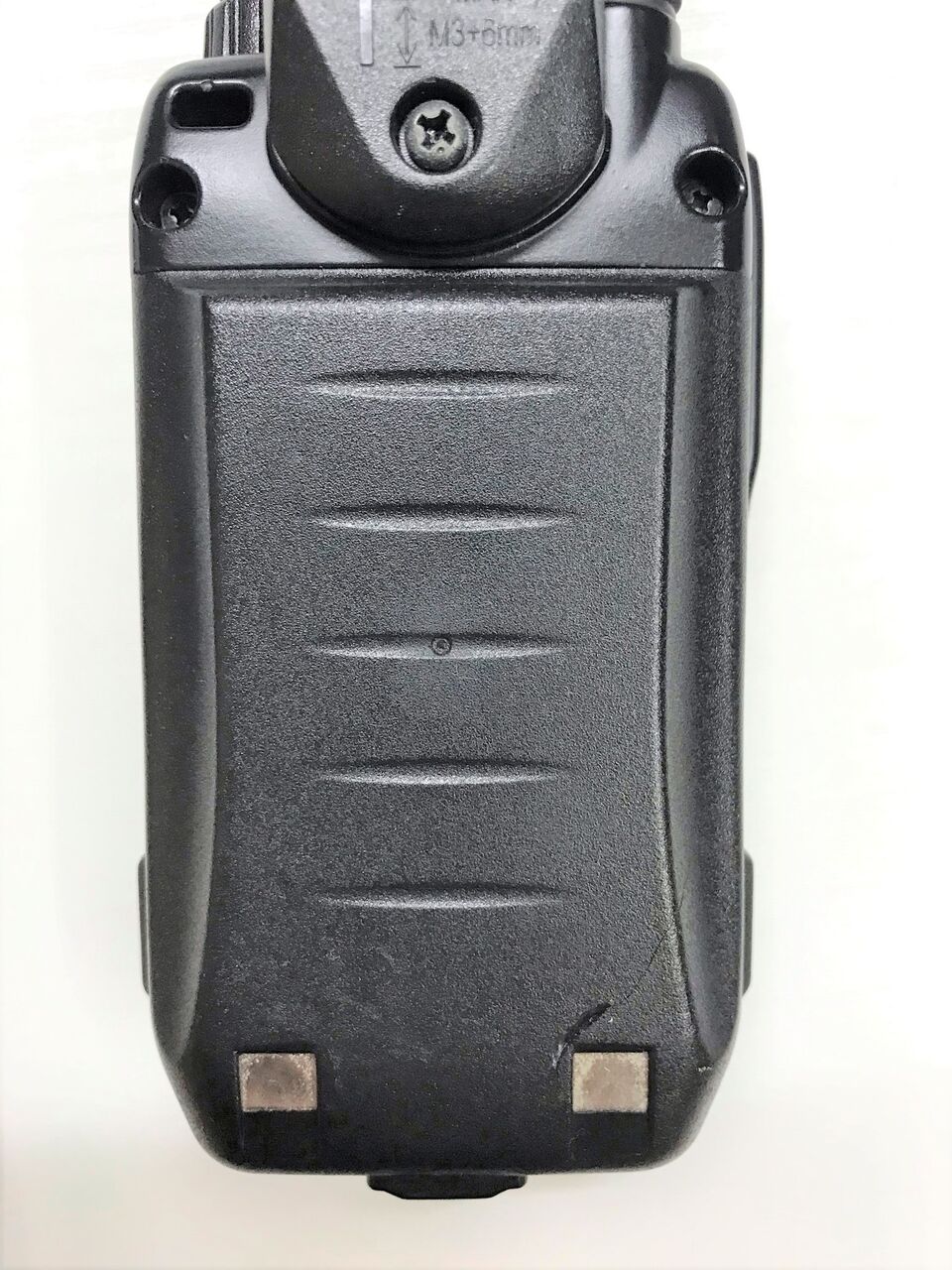DJ-G7のバッテリーをよく見ると充電電極の横に亀裂があります。内部のバッテリーが膨張したようです。
