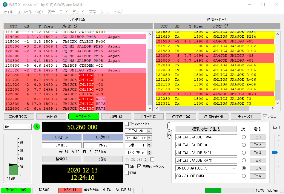 流星バースト通信のチャンスでもあるので、昨夜は夜8時頃から11時頃まで、今朝は6時からWSJT-Xで50.260MHz/MSK144モードでモニターしています。