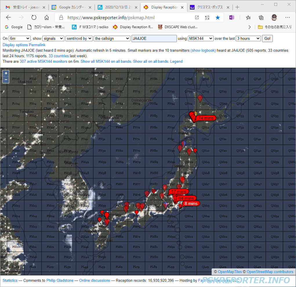 PSKレポーターで見ると50.260MHz/MSK144の局が沢山います。私の信号も散発的に届いているようです。