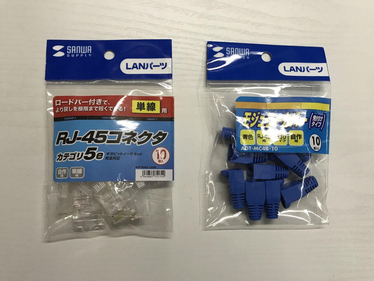 LANケーブルは両端にRJ-45コネクタを圧着して接続しました。今回、ロードバー付きのRJ-45コネクタを使いましたが、ロードバー付きは素人でも失敗しにくいのでお勧めです。