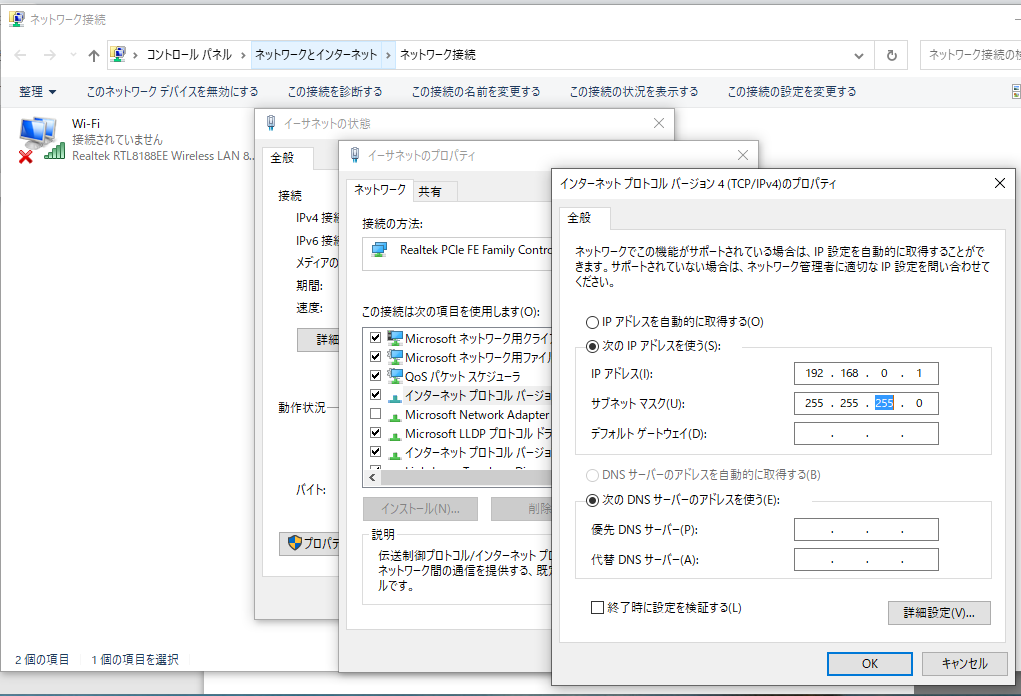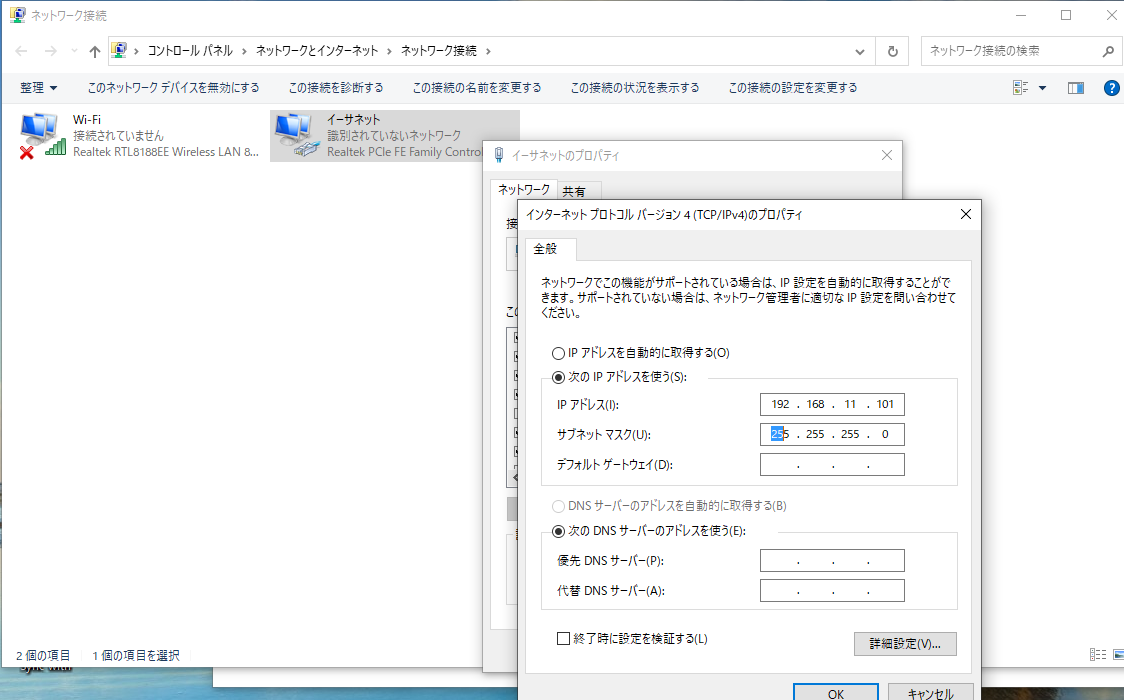 ノートPCはWiFiをオフして、イーサーネットのプロパティーのIPv4プロパティーでネットワークアドレス 192.168.11の適当なIPアドレスを設定します。とりあえず、192.168.11.101にしました。