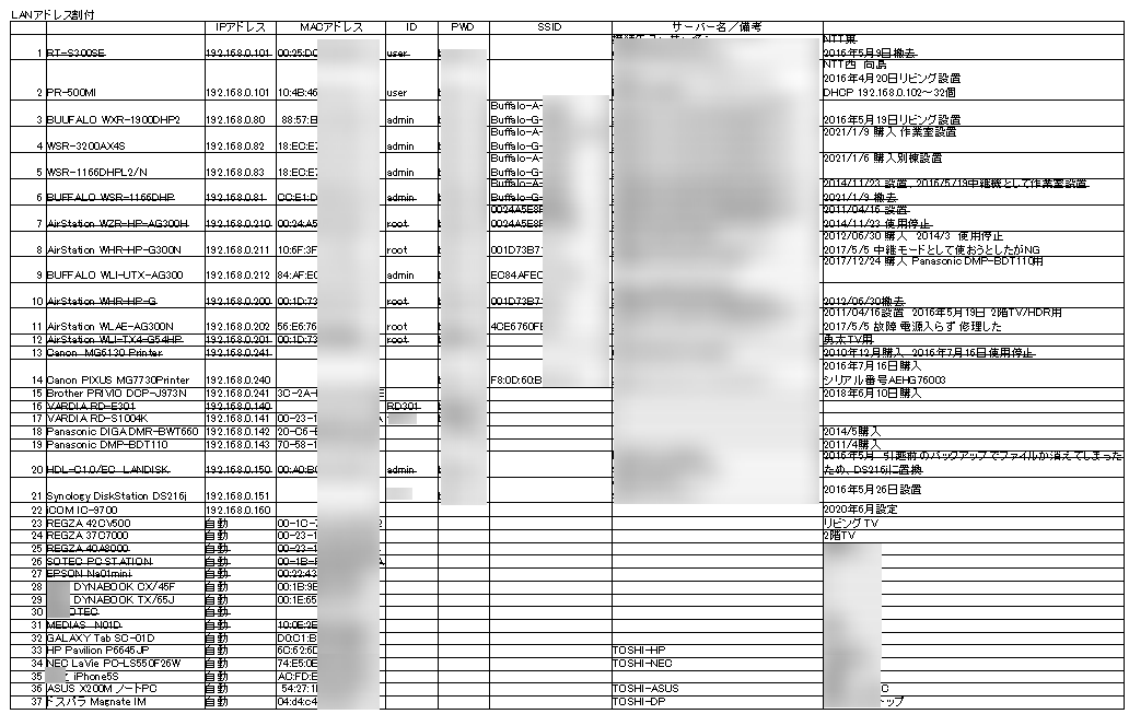 ネットワーク接続機器が多いので、IPアドレスやパスワードを忘れないように表を作って管理しています。