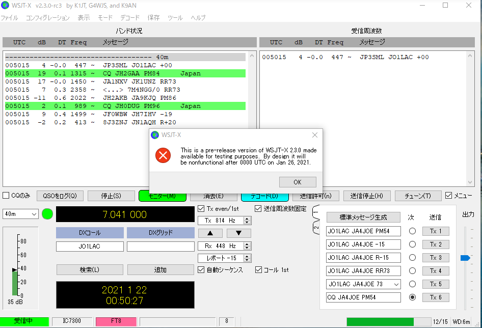 使っていた WSJT-X 2.3.0-rc2 は昨年11月16日にバージョンアップしましたが、使用期限が2021年1月19日でした。