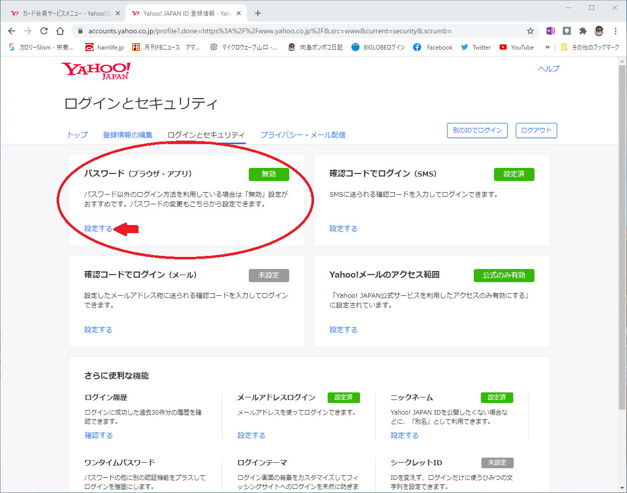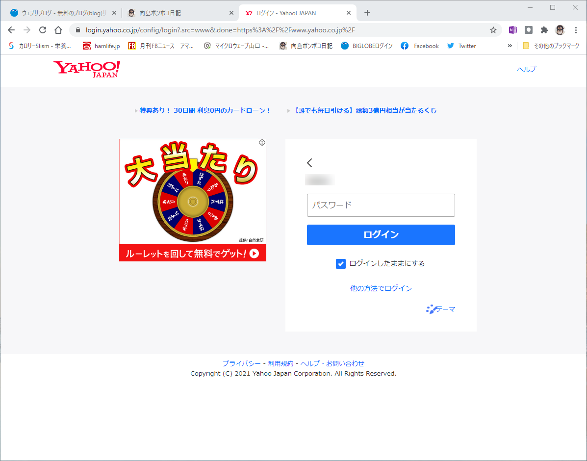再度Yahoo! JAPANにログインするとログイン画面で「他の方法でログイン」が選択可能になるので、他の方法でログインを選んで[パスワード]にします。