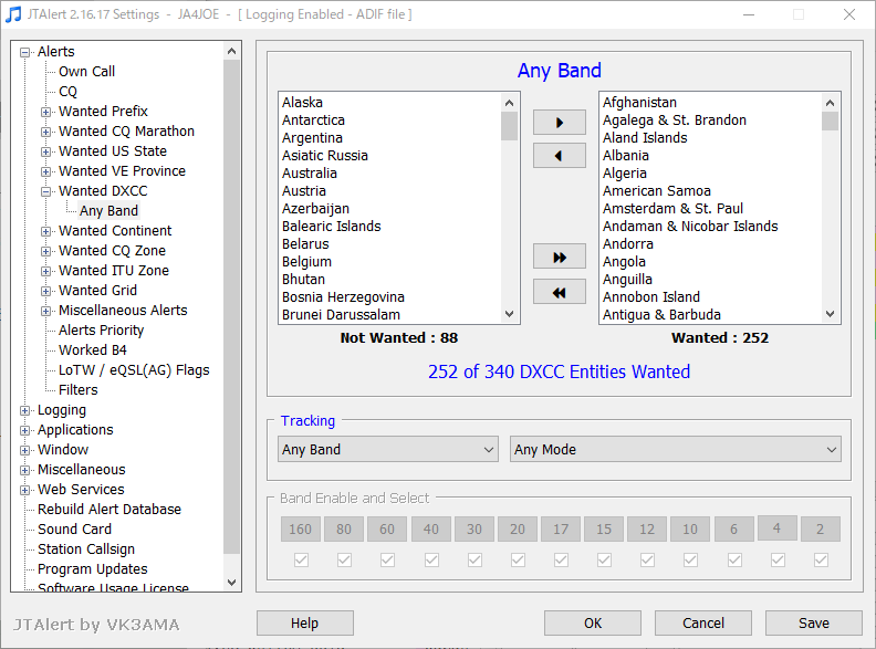とりあえず、MixでDXCCを狙うので、Trackingは[Any Band]、[Any Mode]を選びます。特定のバンドやモードでDXCCを狙う場合は、個別の設定をする事も出来ます。