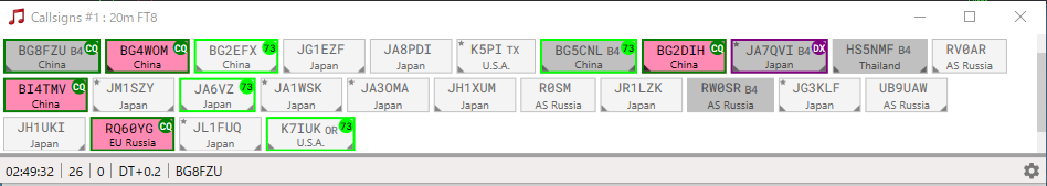 なお、LotW Flag、eQSL Flagはそれぞれ左下、右下に固定です。Online Flag(JTAlertユーザーでメッセージを送れる)は左上に★マークで表示されます。