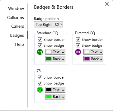 CQ/DX/73のバッチが表示されます。(DXのバッチはCQの後に続く文字が表示されるので、NAやEUになる事もあります。最大4文字)