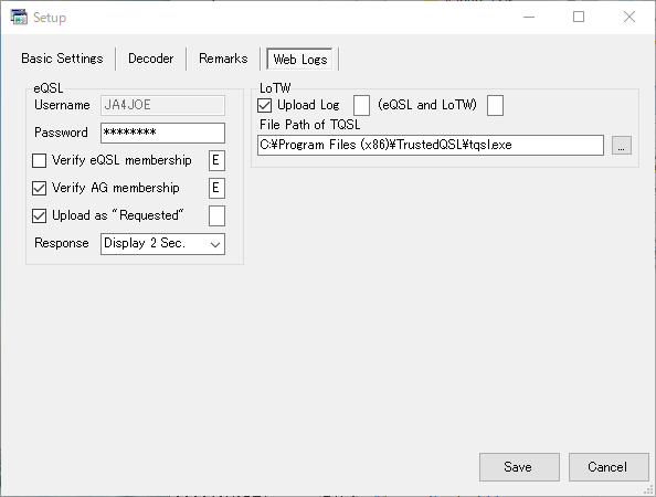 eQSLでは、eQSLのUsernameとPasswaordを設定します。