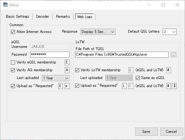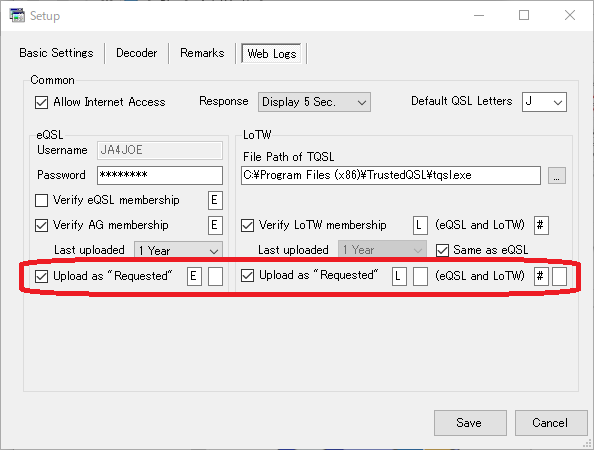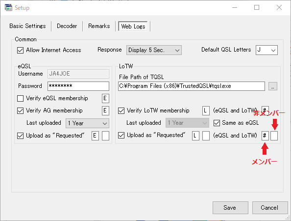 eQSL、LotW、両方へのログアップロード時のHAMLOG QSL欄の2文字目を、それぞれのメンバーかどうかで別々に設定できるようになりました。