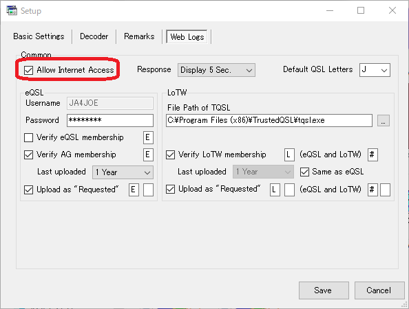[Allow Internet Acsess] チェックするとeQSL AGメンバーリストとLotWユーザーリストをダウンロードします。eQSL、LoTWを使わない場合やネット環境が無い場合はチェックを外しておけばダウンロードされません。
