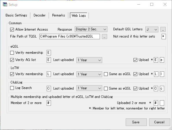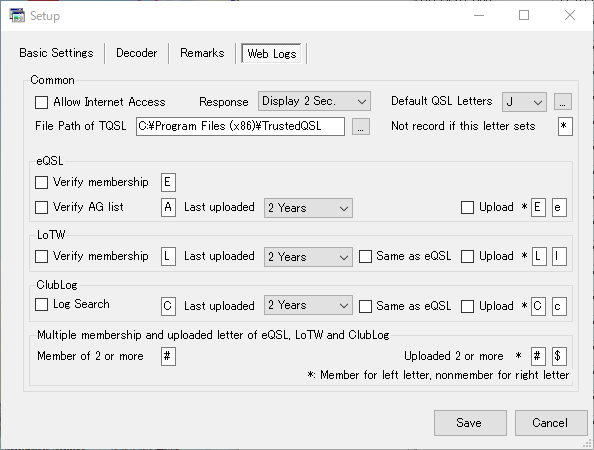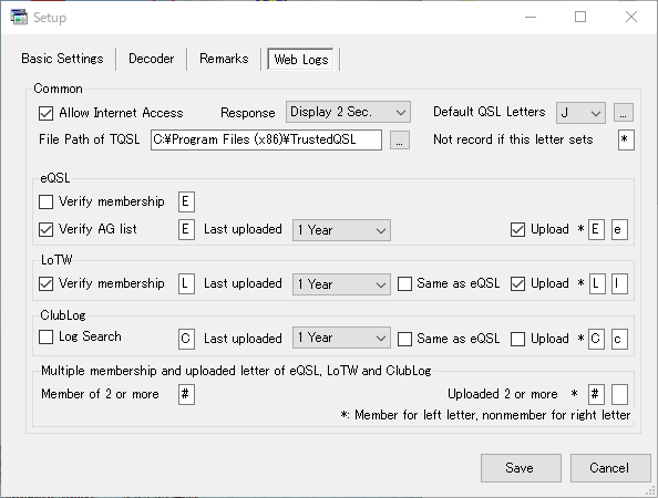 eQSL、LoTW、ClubLogを使う場合はチェックして以降の設定を行ってください。