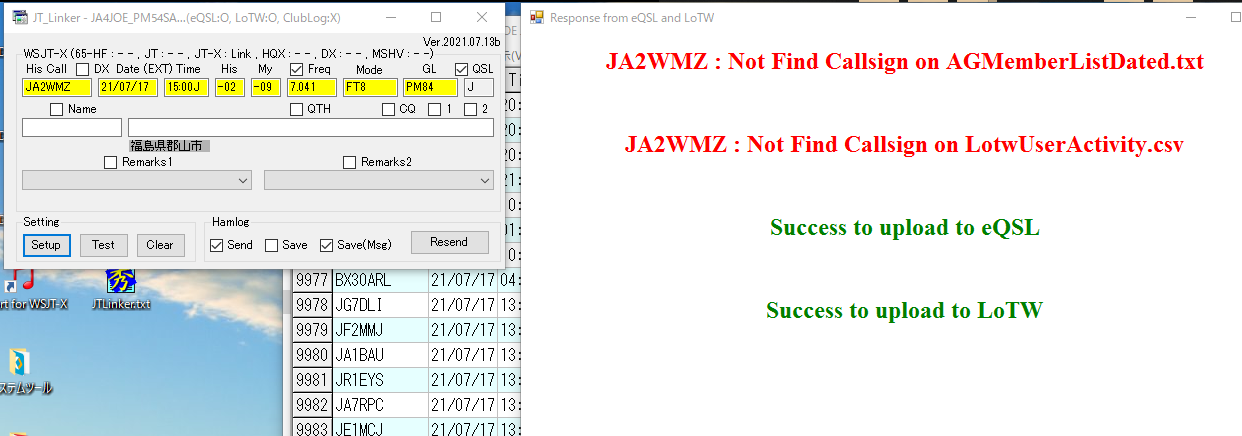 JTDXのログ確認画面の[OK]でログ(wsjt_log.adi)が書き込まれるとJT_LinkerがHAMLOGにデータを転送します。