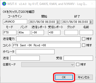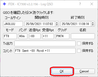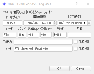 上記の確認画面ではモードと送受レポートが入っていますが、JTDX/WSJT-Xのレポート設定で入れる事ができます。