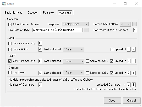 Uploaded 2 or more eQSL、LoTW、ClubLogの2つ以上にアップロードする場合は右の箱の文字「#」または「$」をHAMLOGのQSL欄の2文字目に転送します。QSL欄の2文字目は相手がいずれかの有効メンバーの場合は「#」、すべて非メンバーの場合は「$」になります。