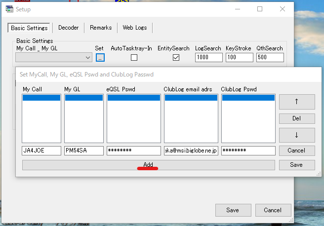 My Call、My GL、eQSL Pswd、ClubLog email adrs、ClubLog pswdを入力してAddでリストに入れます。
