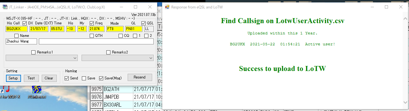HAMLOGへのログ転送前に、LoTW有効メンバーかどうかのチェック結果とアップロード結果の画面が表示されます。