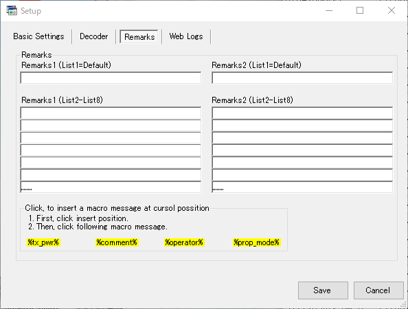 Remarks1 欄およびRemarks2欄に入力する項目を設定しておくことができます。交信に使用したアンテナやリグ名を書いておいて、プルダウンリストから選択してHAMLOGのRemarksに転送するような使い方が出来ます。