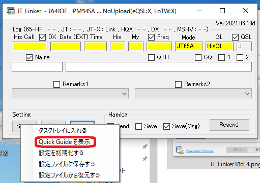 以下、設定と使い方について説明しますが、JT_Linkerの画面上でマウスを右クリックしてQuick Guideを表示する事ができますので、そちらも併せて参考にしてください。