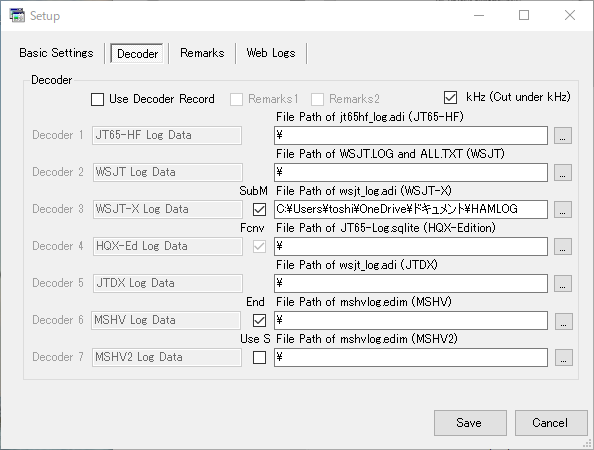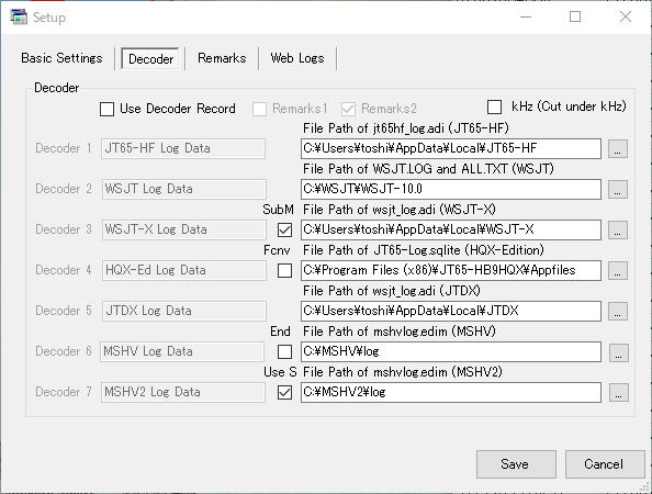 「Use Decorder Record」はチェックするとJT65-HF HB9HQX-Edition、JTDX、MSHVなのか)を記録することが出来ます。