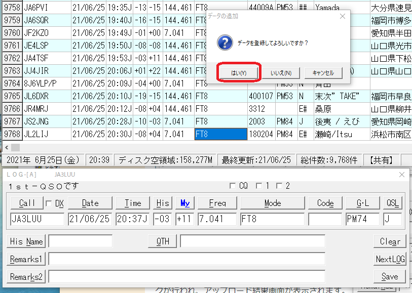 JT_LinkerがHAMLOGにデータを転送して、HAMLOGの登録確認画面が表示されます。HAMLOGで[はい]を選ぶとログが記録されます。