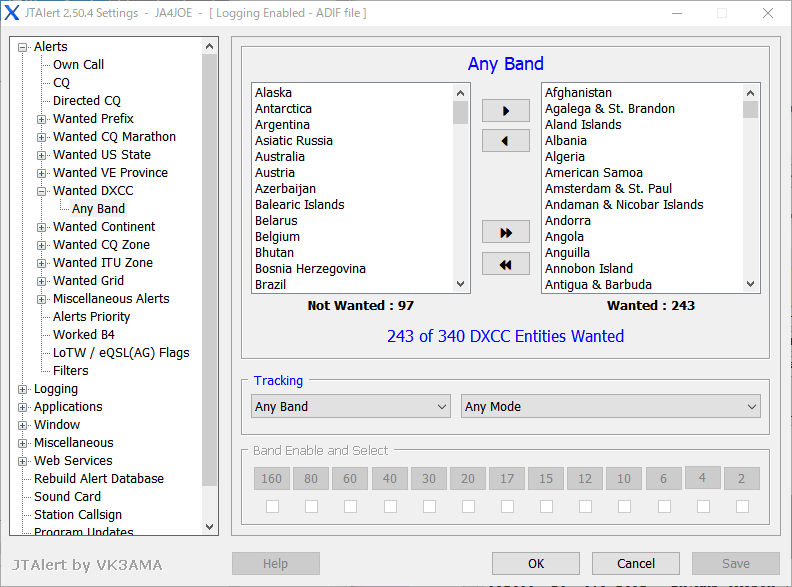 ⑦ 強力なAlert機能があり、Wanted DXCC、Wanted Callsign などを設定しておくと色分と音声で知らせてくれる。