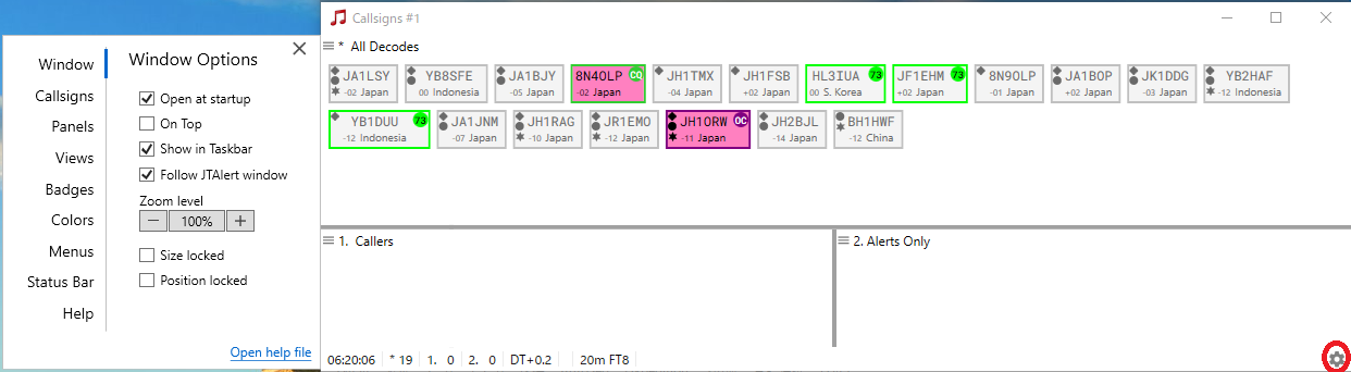他にCallsignsウィンドウが表示されていると思いますが、Callsignsウィンドウについては後で説明します。