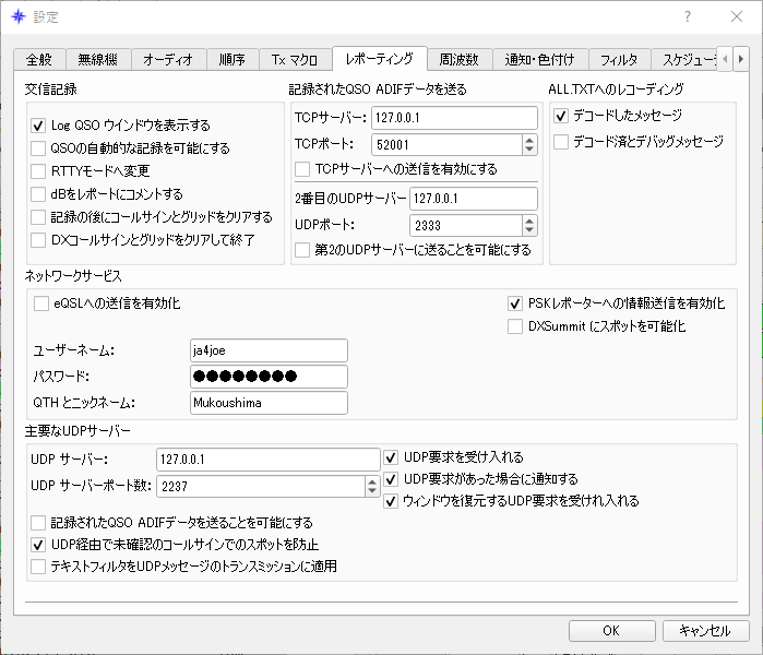 JTDXのメニューバーから ファイル→ 設定→ レポーティング