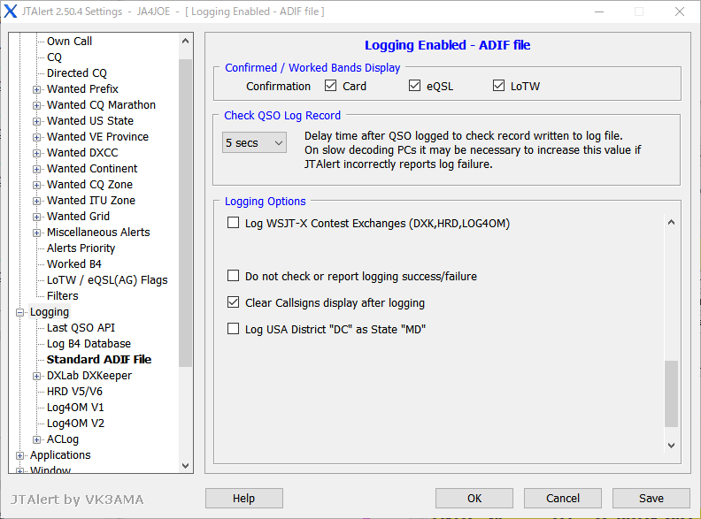 WSJT-X(JTDX)での交信が終わってログを書き込むと、JTAlertもJTAlertのログ(Logging/Standard ADIF Fileで設定したLog File)にログを書き込みます。