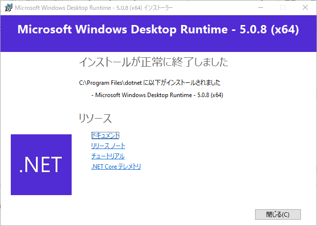 最初に .NET 5 Desktop Runtime のチェック結果画面が出ます。