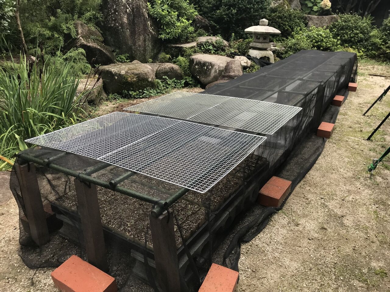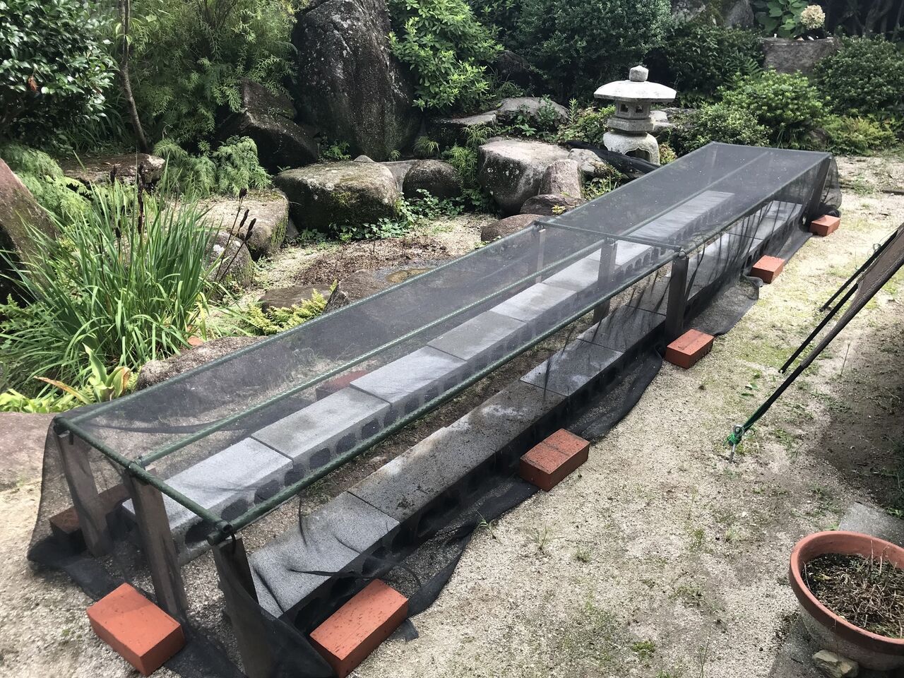 寒冷紗をかけて、周辺をレンガ12個で押さえています。