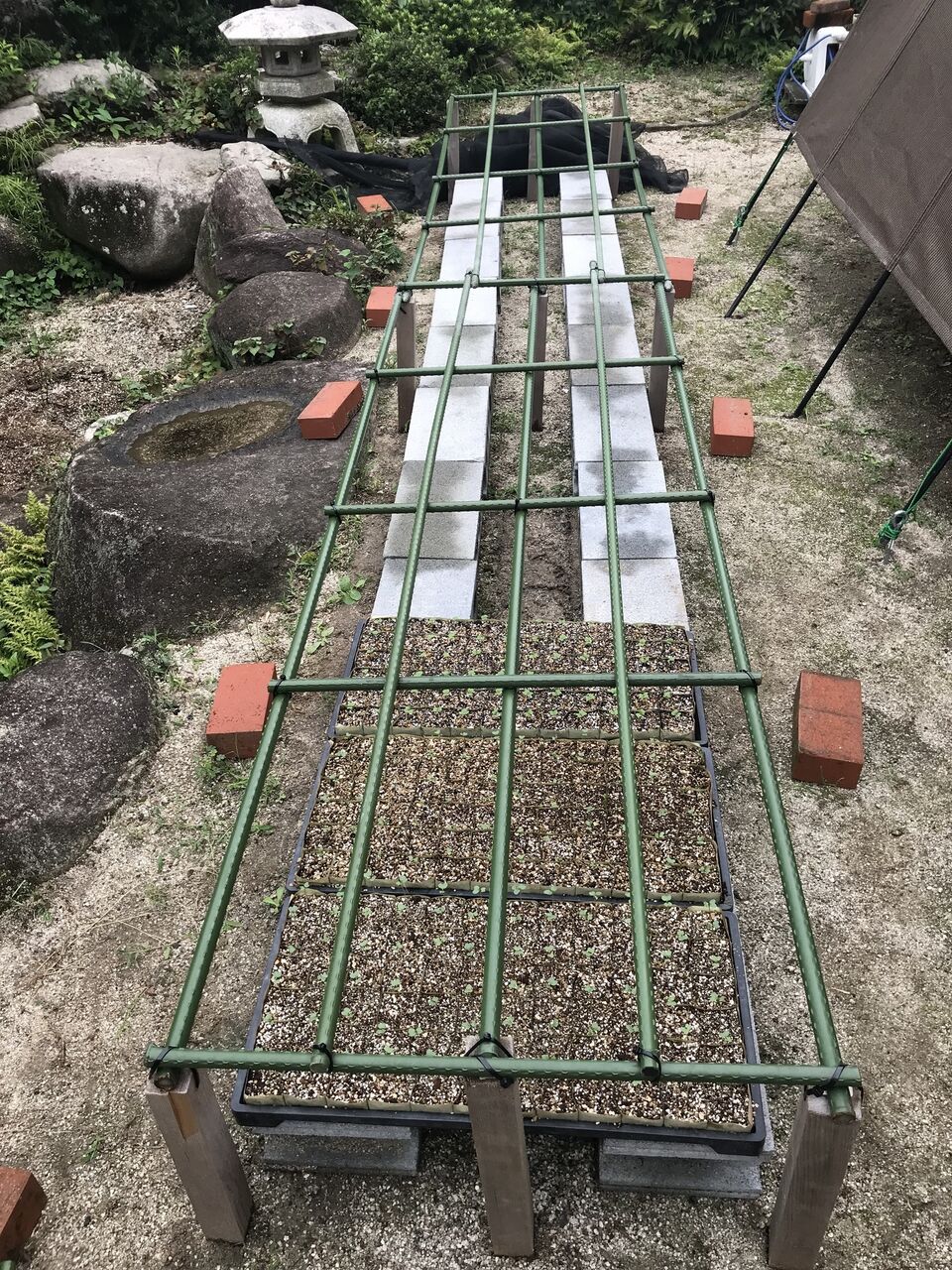 昨年とまったく同じですが、庭にブロックを10個並べて木杭9本を打って、上に2.1m園芸支柱6本を載せて結束バンドで固定します。横方向は園芸支柱を切ったパイプを置いています。