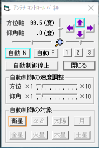 自動制御の対象を [衛星] にして、[自動N] または [自動F] を押す事で自動追尾が始まります。追尾中は方位仰角表示画面にアンテナの向きが表示されます。
