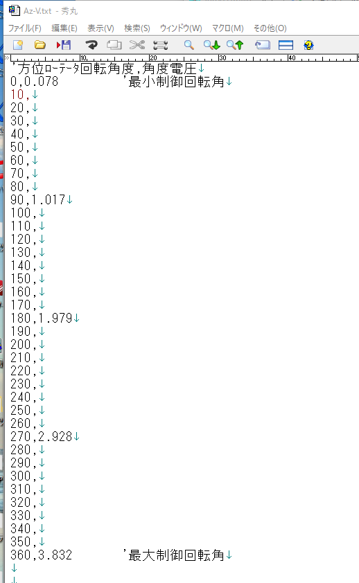 なお、今回方位角ローテーターしか無いので仰角軸の設定をしていませんが、仰角ローテーターがある場合は、仰角軸の測定値をEl-V.txtに設定します。