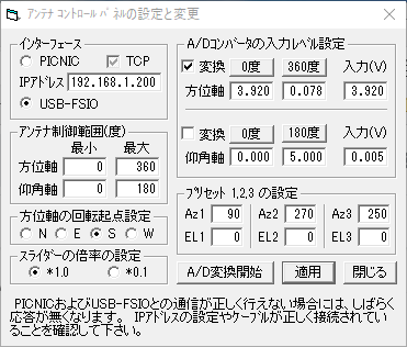 A/Dコンバーターの入力設定で方位軸の「変換」をチェックして[AD変換開始]をクリックします。