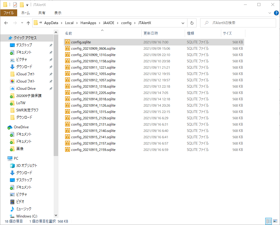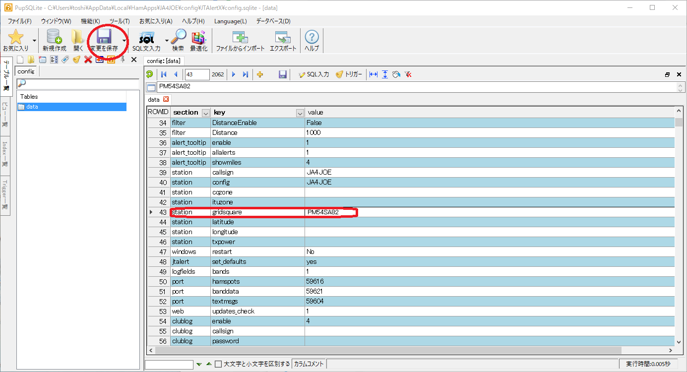 次にJTAlertのconfig.sqliteをPupSQLiteで開きます。config.sqliteはAppDataの下のHamAppsの下にあります。以下は私のファイルパスです。