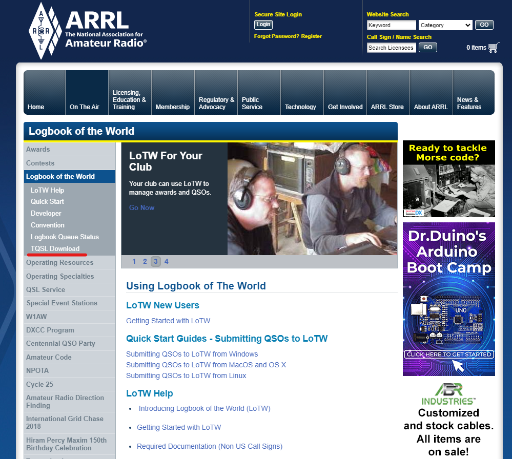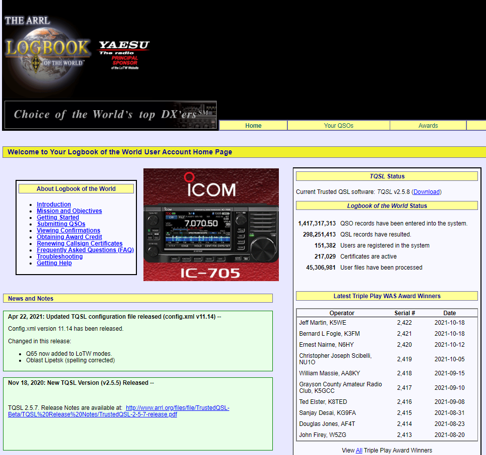 LoTWはARRLの公式電子ログでTQSLというソフトを使って登録、ログのアップロードを行います。
