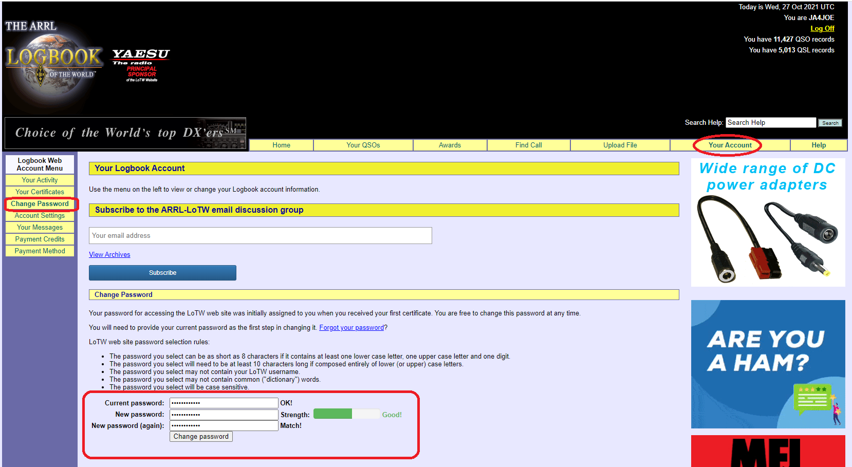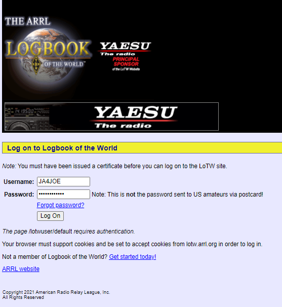 LoTW Webサイト Log on to Logbook of the Worldでコールサインとパスワードを入力してログインします。パスワードはARRLから送られて来た認証完了メールに記載されていたものです。
