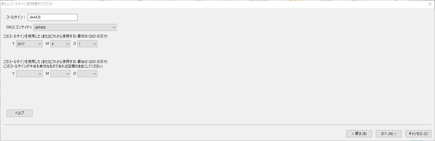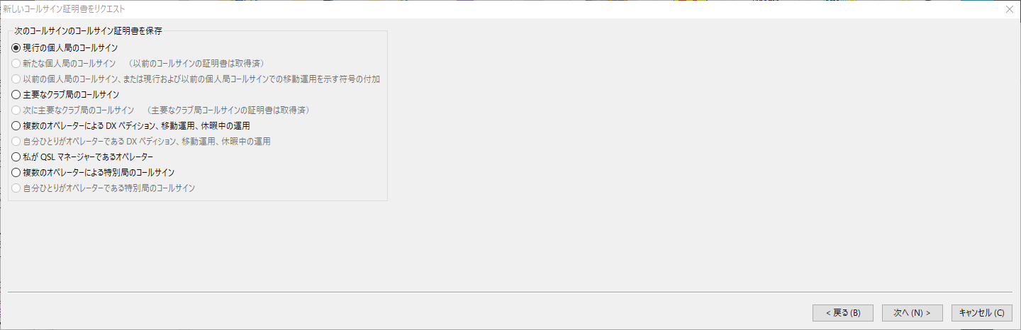 「はい」を選ぶとコールサイン証明書のリクエスト画面が表示されます。次へ