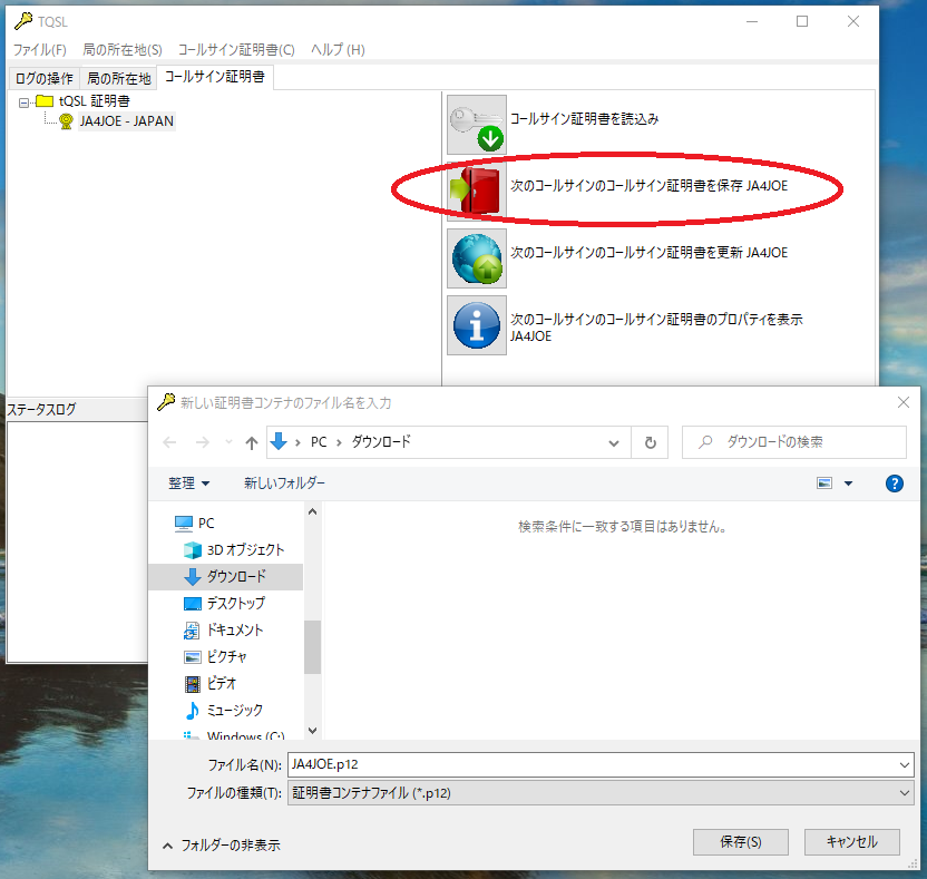 パソコントラブルなどでTQSLの再インストールを行う場合に備えて、コールサイン証明書(.p12)を保存しておくと良いです。