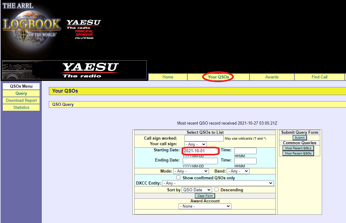 メニューバーの「Your QSOs」を選んで、参照したい期間を設定して「Submit]をクリックします。