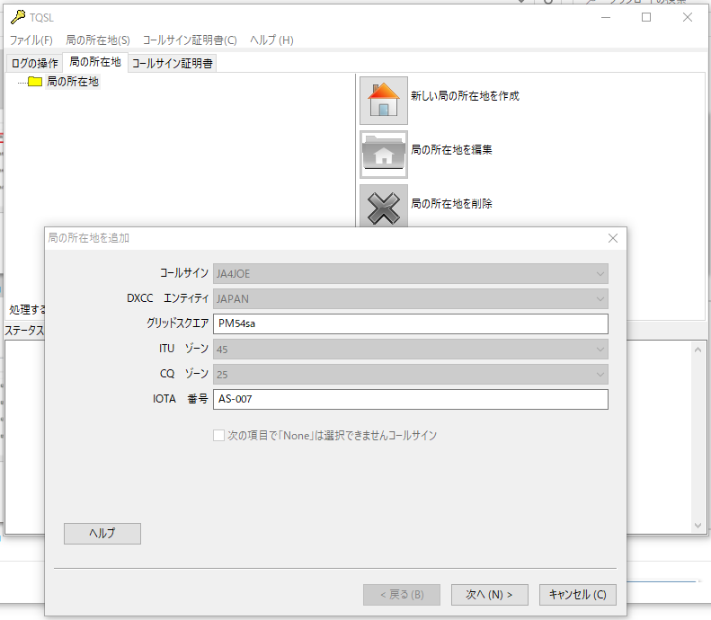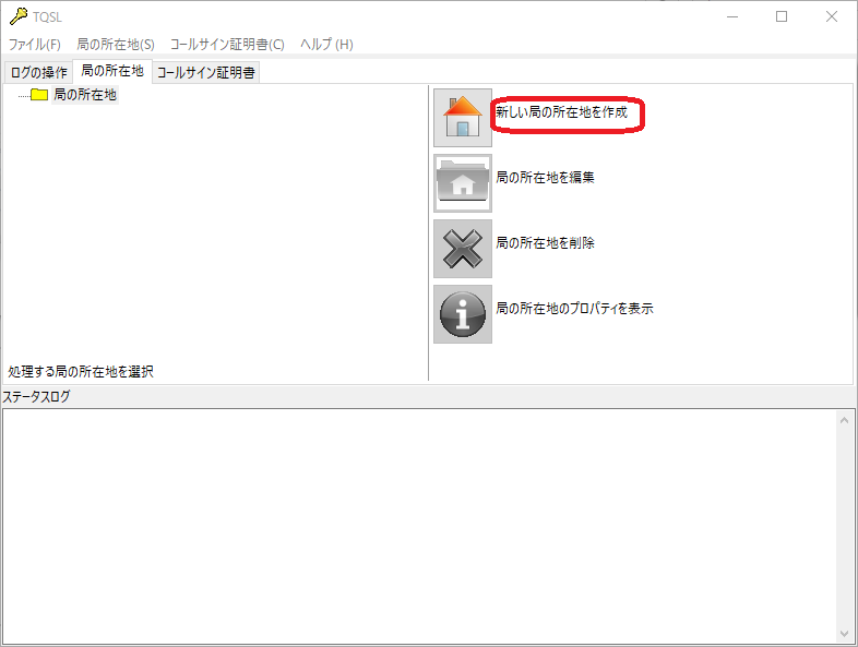 次にTQSLで「新しい局の所在地を作成」を行います。