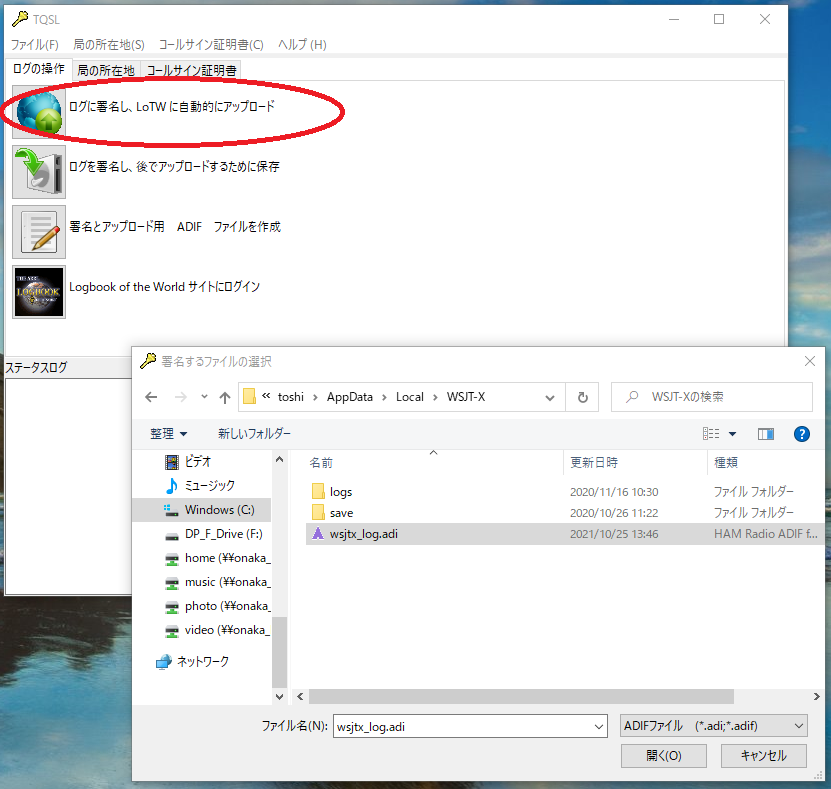 TQSLの「ログの操作」タブで「ログに署名し、LoTWに自動的にアップロード」を選びます。アップロードするログファイルを指定します。