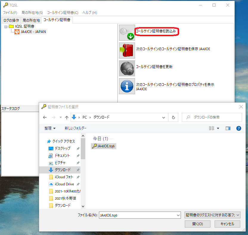 「コールサイン証明書を読込み」を選択して、tq6ファイルを読み込みます。
