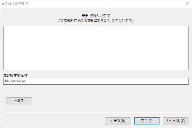 局の所在地名称(私はMukoushimaとしました。)を入れて「完了」